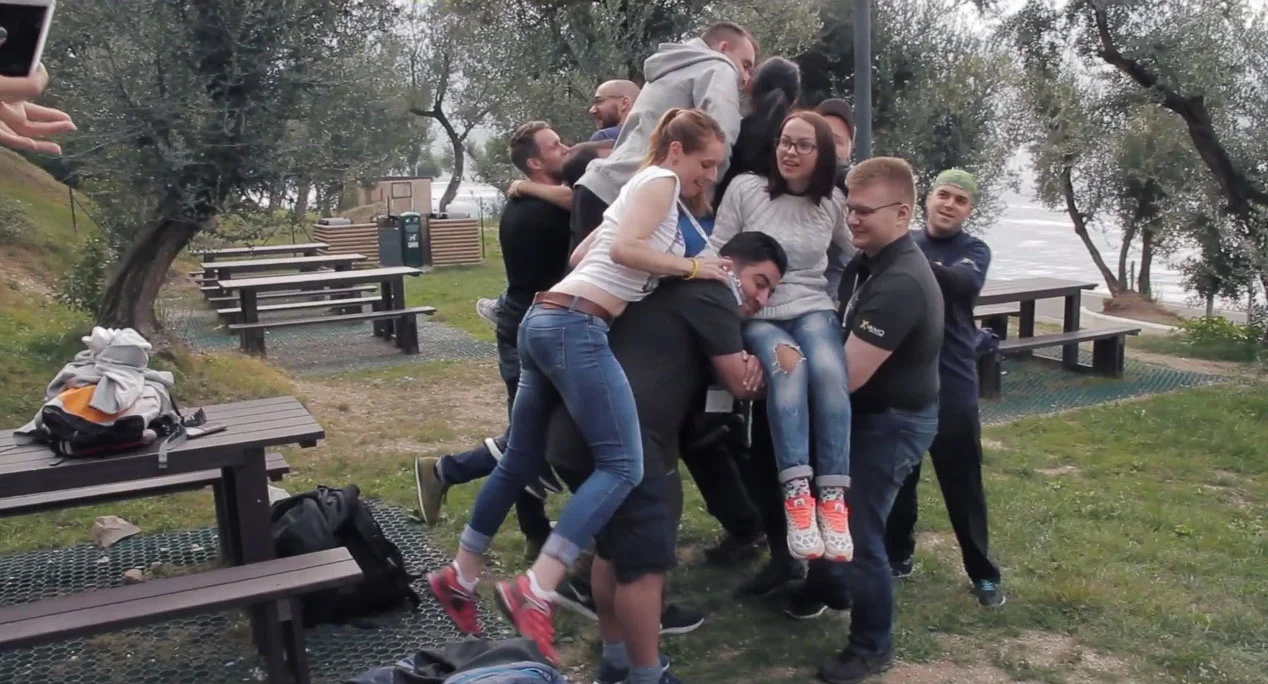 Then half of us are blindfolded and our team mates take turns directing us where to place our puzzle pieces. It takes us 5 min 42 secs to complete the first challenge and we're off to station #2. As we run we read the instructions. We're to make a human pyramid. Points are awarded for the fewest points of contact with the ground. We're 18 people and manage to create a structure with only 5 legs touching the ground.